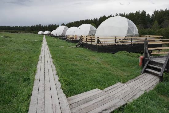 Чем глэмпинг-парк привлекает туристов, оценил Дмитрий Азаров. Он осмотрел домики-купола и обсудил с руководителями проекта развитие территории, а также туристических услуг и экскурсий, на которые местных гостей возят на электрокаре.