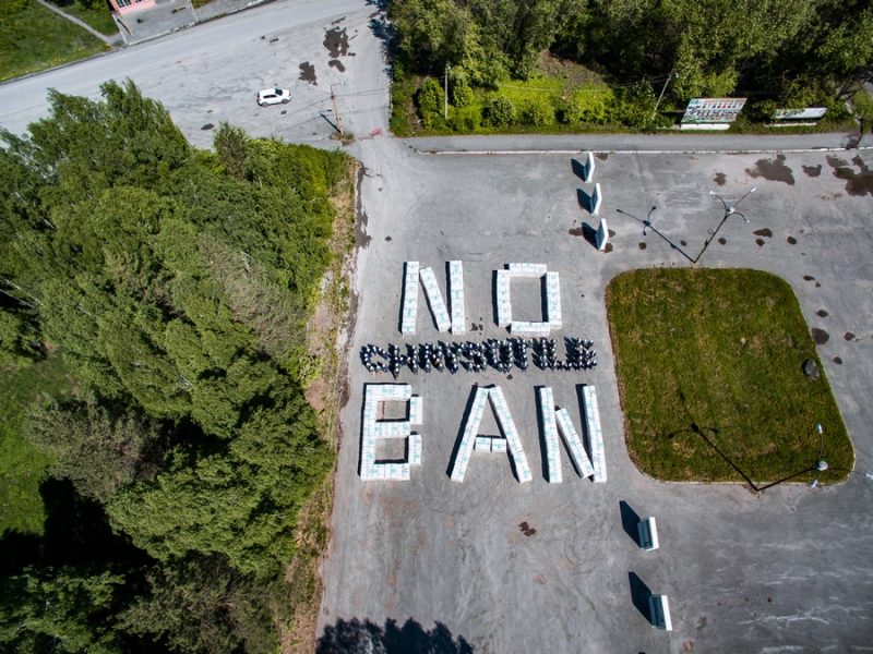 Рабочие Асбестообогатительной фабрики ПАО «Ураласбест» организовали PR-акцию в поддержку отечественной хризотилодобывающей промышленности. «No chrysotile ban» означает «Нет запрету хризотила!» и является лозунгом России, Казахстана, Узбекистана, Беларуси и других стран в борьбе за международное признание горного льна. Работники завода выложили слова «No» и «Ban» паллетами с хризотилом, а сам «chrysotile» сформировался из 90 специалистов коллектива предприятия. Фотографию сделали с квадрокоптера.
