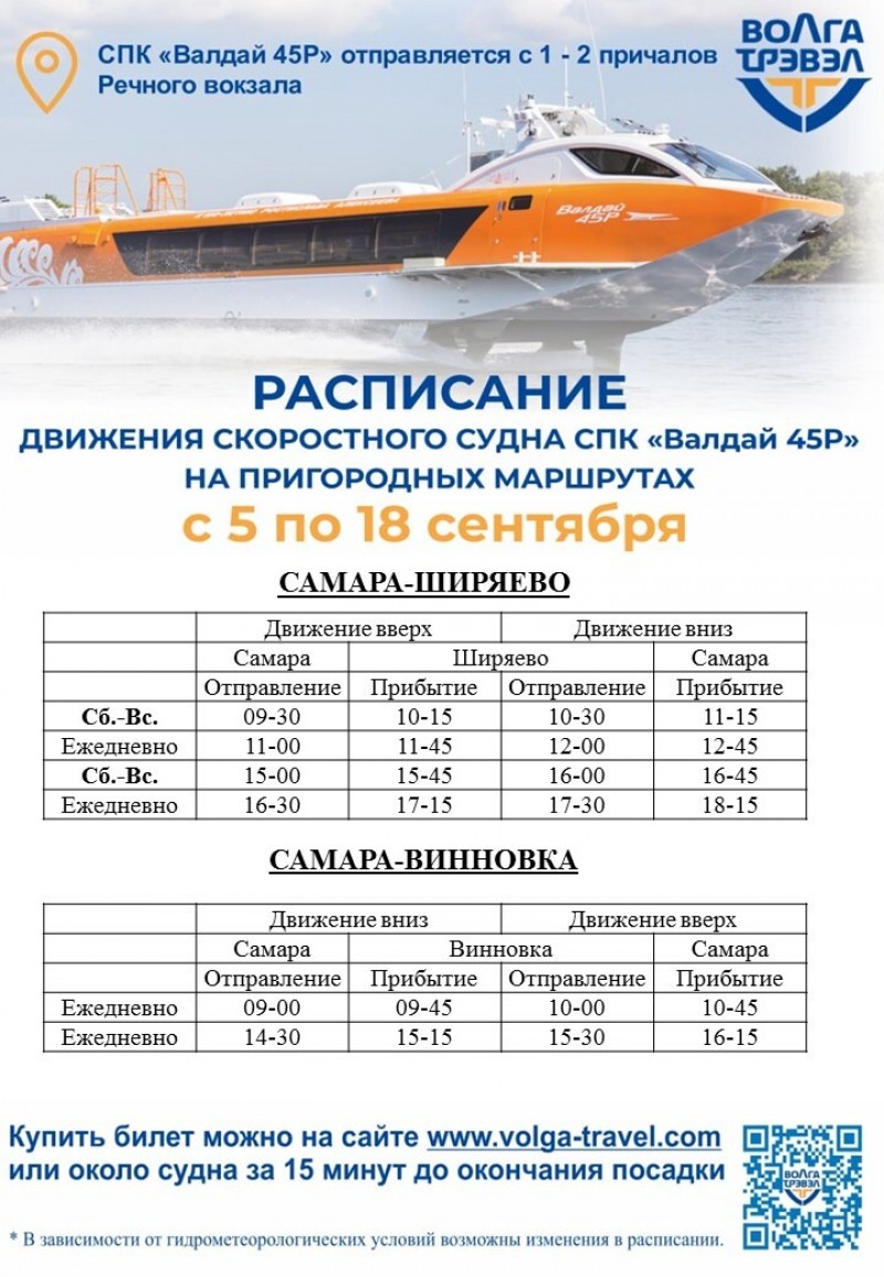 Появилось изменение в расписании скоростных судов «Валдай 45Р», следующих по направлениям «Самара – Ширяево – Самара» и «Самара – Винновка – Самара». С 5 сентября ежедневно будут совершаться два рейса на Винновку и два рейса до Ширяево.