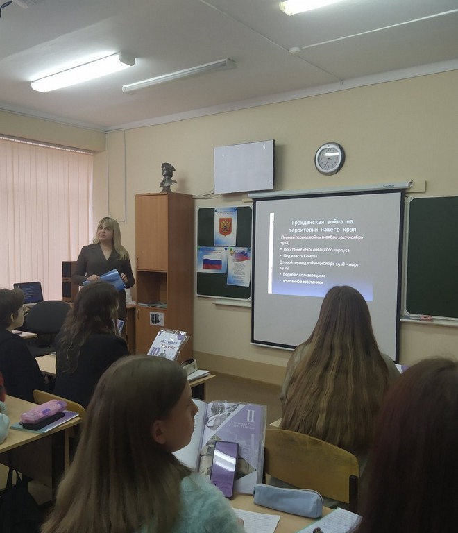 М.А.Лахмистрова познакомила учащихся с событиями Гражданской войны, которые непосредственно коснулись Сызранского уезда: белочешским мятежом, деятельностью Комуча (Комитета учредительного собрания), одним из самых крупных крестьянских восстаний против большевиков «чапанной войной».