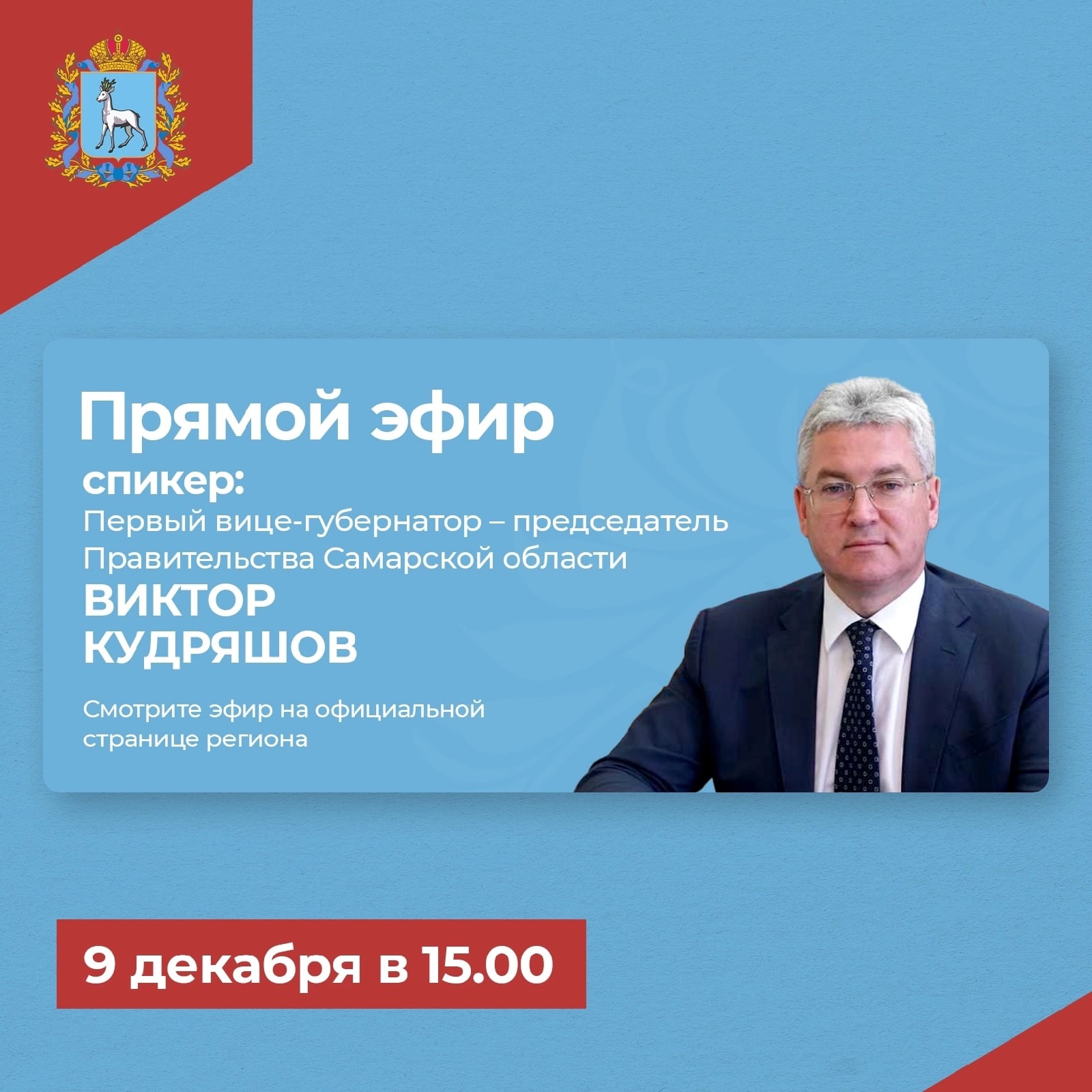 О реализации национальных проектов, экономике Самарской области и приоритетах в работе власти сегодня, в 15:00 в прямом эфире говорим с первым вице-губернатором – председателем Правительства Самарской области Виктором Кудряшовым.