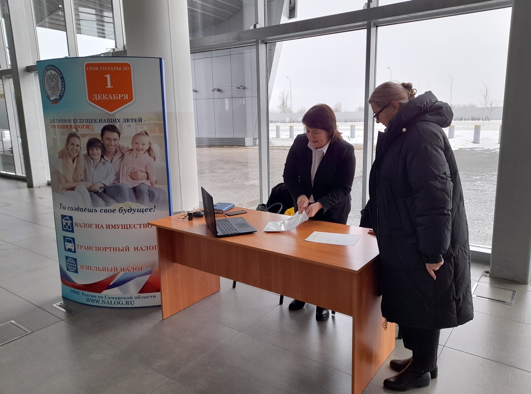 В рамках проведения информационной кампании по уплате имущественных налогов физическими лицами по сроку 1 декабря 2022 года сотрудниками Межрайонной ИФНС России № 20 по Самарской области осуществлен выезд мобильной группы в Международный аэропорт Курумоч.