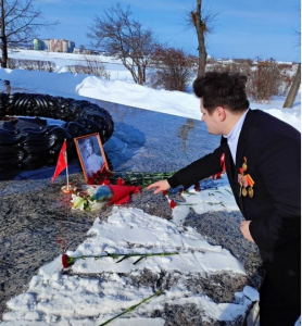 Актер Сызранского драматического театра Сергей Малышев почтил память своего дедушки Дмитрия Мусорина, которому 23 февраля исполнилось бы сто лет. В память о нем Сергей организовал памятную акцию у Вечного огня, куда принес фото ветерана Великой Отечественной войны и возложил цветы.
