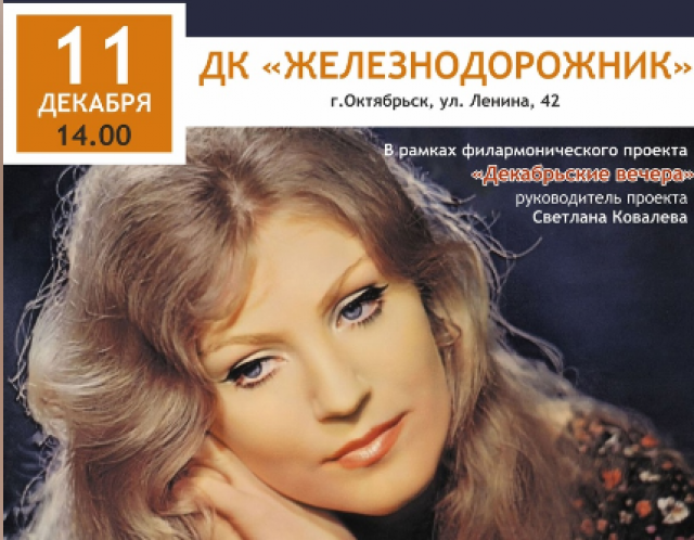 В Октябрьске состоится концерт, посвященный творчеству знаменитой звезды советской эстрады Анны Герман. Он пройдет в рамках в рамках ежегодного филармонического проекта "Декабрьские вечера" с оркестром "Русские фрески". Зрители смогут послушать любимые песни в исполнении популярного инструментального ансамбля.