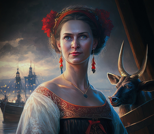 Нейросеть Midjourney нарисовала города Самарской области в образе человека. К примеру, Сызрань, по мнению искусственного интеллекта - это девушка с волнистыми волосами, перевязанными алой тканью и в красном-белом кафтане, на фоне реки. Возможно, нейросеть нарисовала реку Сызранку или Волгу, по которой идет корабль. За левым плечом у девушки - символ города, который красуется на гербе - черный бык, а в руках тыквы, которые хоть и не являются достопримечательностью Сызрани, но найдутся у многих местных дачников.