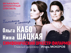 На одной сцене соединяются две стихии, две неповторимых женщины – актриса, заслуженная артистка России Ольга Кабо и певица, исполнительница романсов заслуженная артистка России Нина Шацкая. В спектакле с названием " Память о солнце " они воплощают яркие образы утраченного прошлого и приобретенного настоящего, где любовь превращается в жертвенность, а мечта о простом женском счастье становится неосуществимой. Ведь именно так рождался поэтический дар Анны Ахматовой.