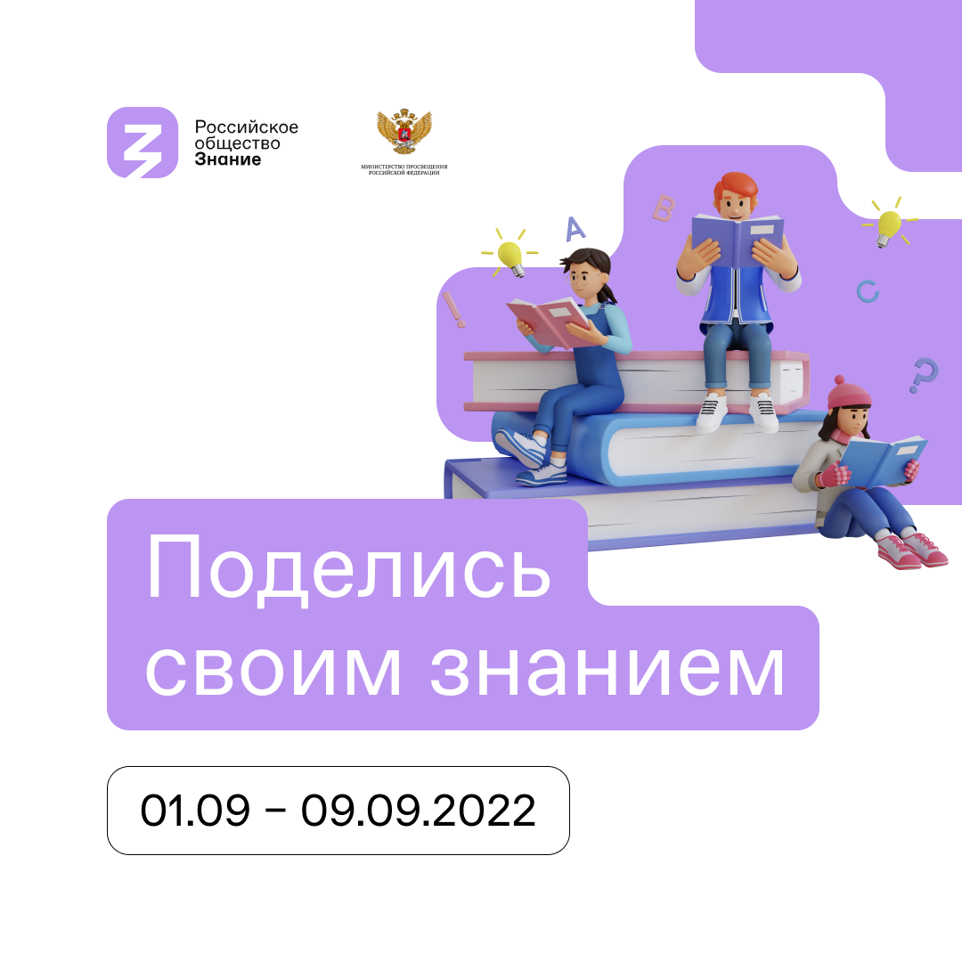 С 1 по 9 сентября 2022 года пройдет Всероссийская просветительская акция «Поделись своим Знанием», организованная Российским обществом «Знание» при поддержке Министерства просвещения РФ и Министерства науки и высшего образования РФ. Акция охватит сотни тысяч школьников и студентов как в городах-миллионниках, так и в самых удаленных уголках страны. В роли лекторов выступят известные государственные и общественные деятели, выдающиеся ученые, популяризаторы науки, лидеры бизнеса, представители сферы культуры и искусства, спортсмены и другие наставники, которые добились успеха и готовы делиться знаниями с молодым поколением.