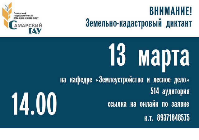 Учебно-методический совет по направлению подготовки «Землеустройство и кадастры» федерального УМО по УГСНП 21.00.00 Прикладная геология, горное дело, нефтегазовое дело и геодезия, Центр развития образования в области землеустройства и кадастров ФГБОУ ВО "Государственный университет по землеустройству" (г. Москва) на площадке ФГБОУ ВО «Самарский государственный аграрный университет» организует проведение «Земельно-кадастрового диктанта» в рамках ежегодной международной просветительской акции, приуроченной к профессиональному празднику.