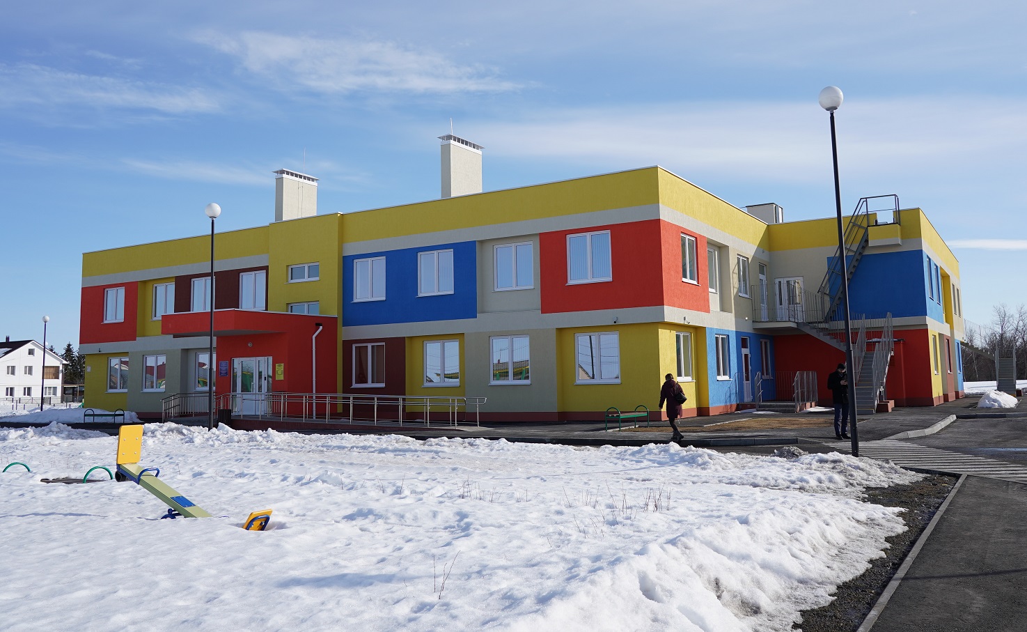 Фасад двухэтажного здания выполнен в ярких цветах и напоминает фигуры игры «Тетрис». На территории дошкольного учреждения – теневые навесы и оборудованные спортивные площадки. Предусмотрено все для обеспечения безопасности ребят: здание оборудовано системами противопожарной защиты, видеонаблюдения, охранной сигнализации, системой охраны входов в здание, установлено ограждение. Родители признаются: дети идут в садик с удовольствием.