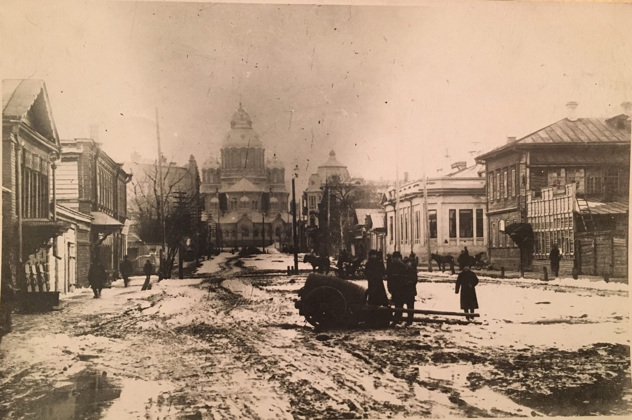 У Соборной площадиБольшая семья жила в бревенчатом двухэтажном доме-пятистенке. Он располагался на углу современных улиц Красноармейской и Молодогвардейской — напротив того места, где сегодня находится магазин «Сюрприз». С искусно сделанными резными наличниками и другими архитектурными излишествами, дом был настоящим памятникам русского зодчества. Из окон Ширмановых открывался чудесный вид на Соборную площадь. И они были свидетелями строительства величественного храма Воскресения Христова, разрушенного в 1930-е годы. В семье сохранилась фотография установки колокола на соборе.