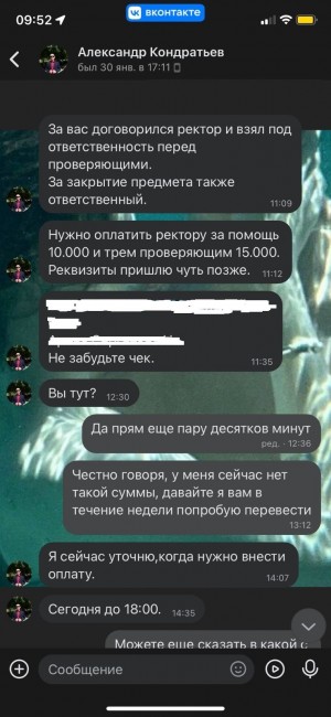 Так, студентку одного из вузов г. Самары в группе социальной сети «ВКонтакте» несколько пользователей (зарегистрированы на территории Украины) убедили в невозможности самостоятельной сдачи экзамена и предложили решение этого вопроса якобы через сотрудника вуза, пользователя «Александр Кондратьев», который в личной переписке за денежное вознаграждение предложил решить проблему со сдачей экзамена. После того, как студентка перевела денежные средства на банковские карты, указанные пользователи перестали выходить на связь и удалили свои аккаунты.