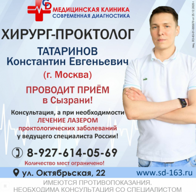 Речь идет о «деликатных» заболеваниях. 9 и 10 октября Константин Евгеньевич Татаринов, врач хирург-колопроктолог, проведет прием и лечение сызранских пациентов.