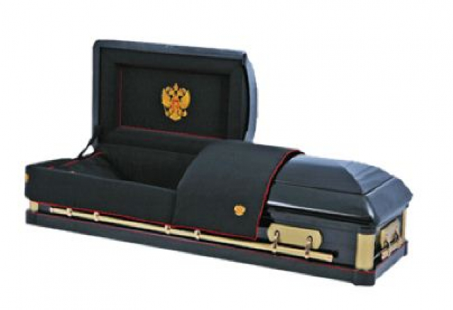 Россиянам предложили необычную услугу захоронения умерших. В Москве частная фирма предлагает приобретать элитные гробы с золотым двуглавым орлом за более чем полмиллиона рублей. Гроб с российской символикой можно заказать на сайте компании. Для этого надо указать Ф.И.О. умершего, его рост при жизни и размер одежды. Любопытно, что гроб с российским гербом произведен в Украине.