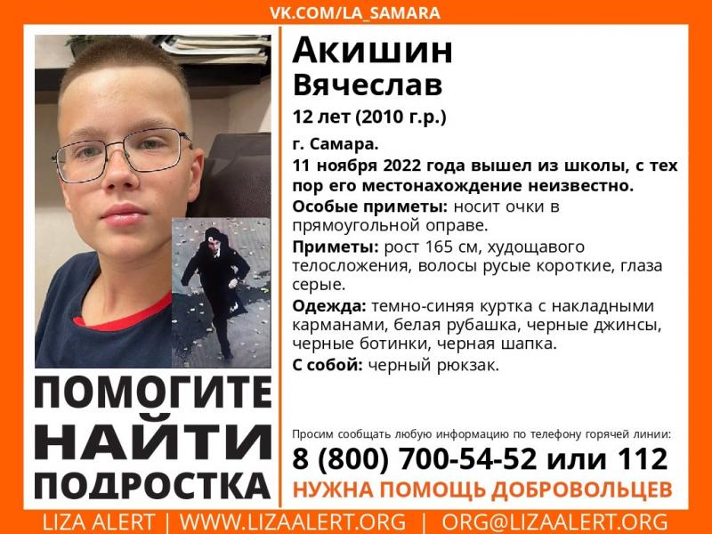 12-летний Вячеслав пропал в пятницу, 11 ноября, в Самаре. Он вышел из школы, с тех пор его местонахождение неизвестно. Добровольцы "ЛизаАлерт" организовали поиски мальчика.