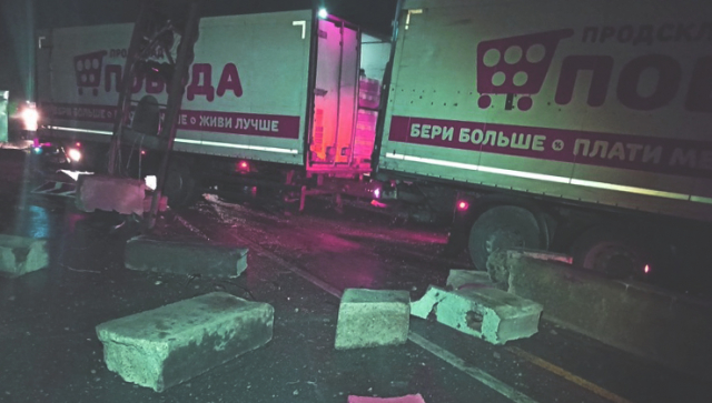 Из обстоятельств ДТП известно, что на 881 километре трассы в районе гостиницы «Старый Хутор» большегруз с прицепом врезался в бетонные блоки. От удара у тягача вырвало переднее правое колесо и был разбит бампер. На фото четко видно, что сами бетонные блоки разлетелись по всей дороге.