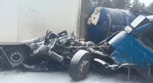 Массовое ДТП на федеральной трассе М-11 "Нева" произошло в 11.20 после столкновения двух грузовиков. По данным УГИБДД по региону, одна женщина погибла, еще одна доставлена в Новгородскую областную больницу, а четыре ребенка доставлены в Детскую областную больницу. Движение по федеральной трассе по направлению в Москву, где, по уточненным данным автоинспекторов, столкнулась 41 машина, было перекрыто, на трассе образовалась многокилометровая пробка. На месте аварии работают сотрудники МЧС, ситуация осложняется разлитием битума из битумовоза, утечку ликвидируют. Были организованы пункты обогрева для водителей.
