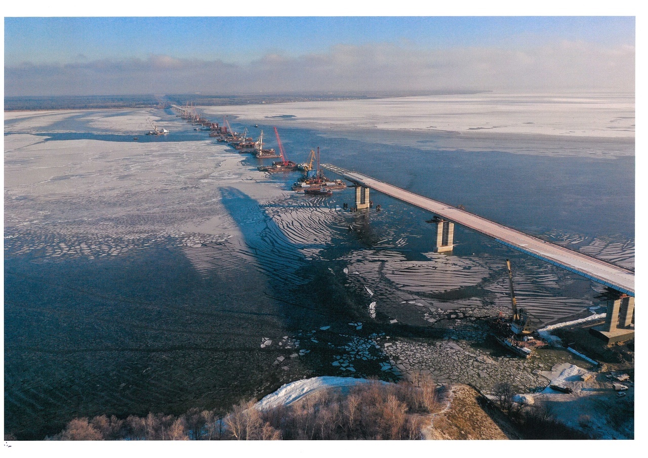 Для обеспечения бесперебойной работы по возведению опор моста в акватории р. Волга поставка строительных конструкций и материалов осуществляется плавсредствами по воде, свободной ото льда.