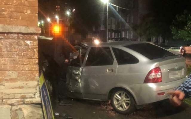 После жесткого столкновения кроссовер проехал еще несколько метров и врезался в дерево, а Приора вылетела с дороги, снесла дорожный знак и врезалась в кирпичное здание.