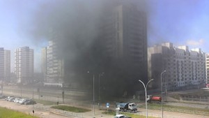 Рядом с новостройкой образовалось густое черное облако дыма. Пожар произошел на первом этаже здания. По словам местных жителей, дом на момент пожара был нежилым, хозяева квартир въехать в них еще не успели. На место происшествия сразу выехала пожарная бригада.