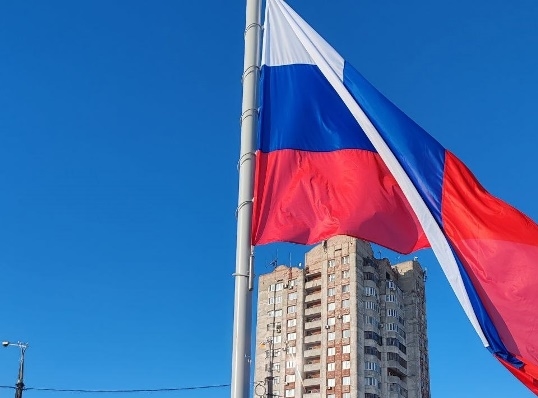 Под звуки гимна триколор торжественно взмыл в небо Сегодня, 15 марта, с утра на кольцевой развязке на пересечении улицы Громовой и улицы Матросова состоялась церемония поднятия флага Российской Федерации.
