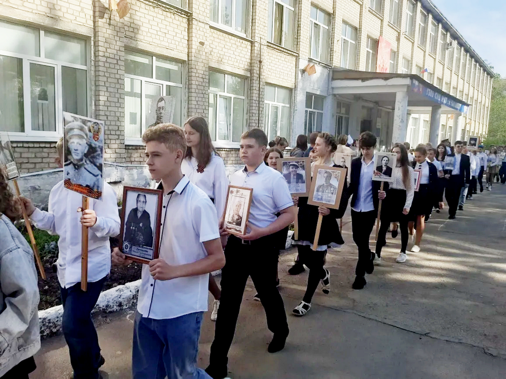 Затем учащиеся подняли над шеренгами портреты своих предков и почтили память погибших на фронтах Великой Отечественной войны минутой молчания. Под мерный звук метронома склонив головы, стояли плечом к плечу педагоги, ученики и их родители. Они почувствовали себя причастными к великому событию, которое не сгладят в памяти людской ни годы, ни века! Затаив дыхание, участники мероприятия слушали стихи о том грозном времени и гимн о бессмертном подвиге народа — песню «День Победы». Почетный гость, командир радиовзвода РХБЗ, лейтенант Виталий Локтев рассказал, что для него значит День Победы. Директор школы Валентина Воронкова выразила слова благодарности всем соотечественникам, которые выбрали для себя профессию «Родину защищать!».