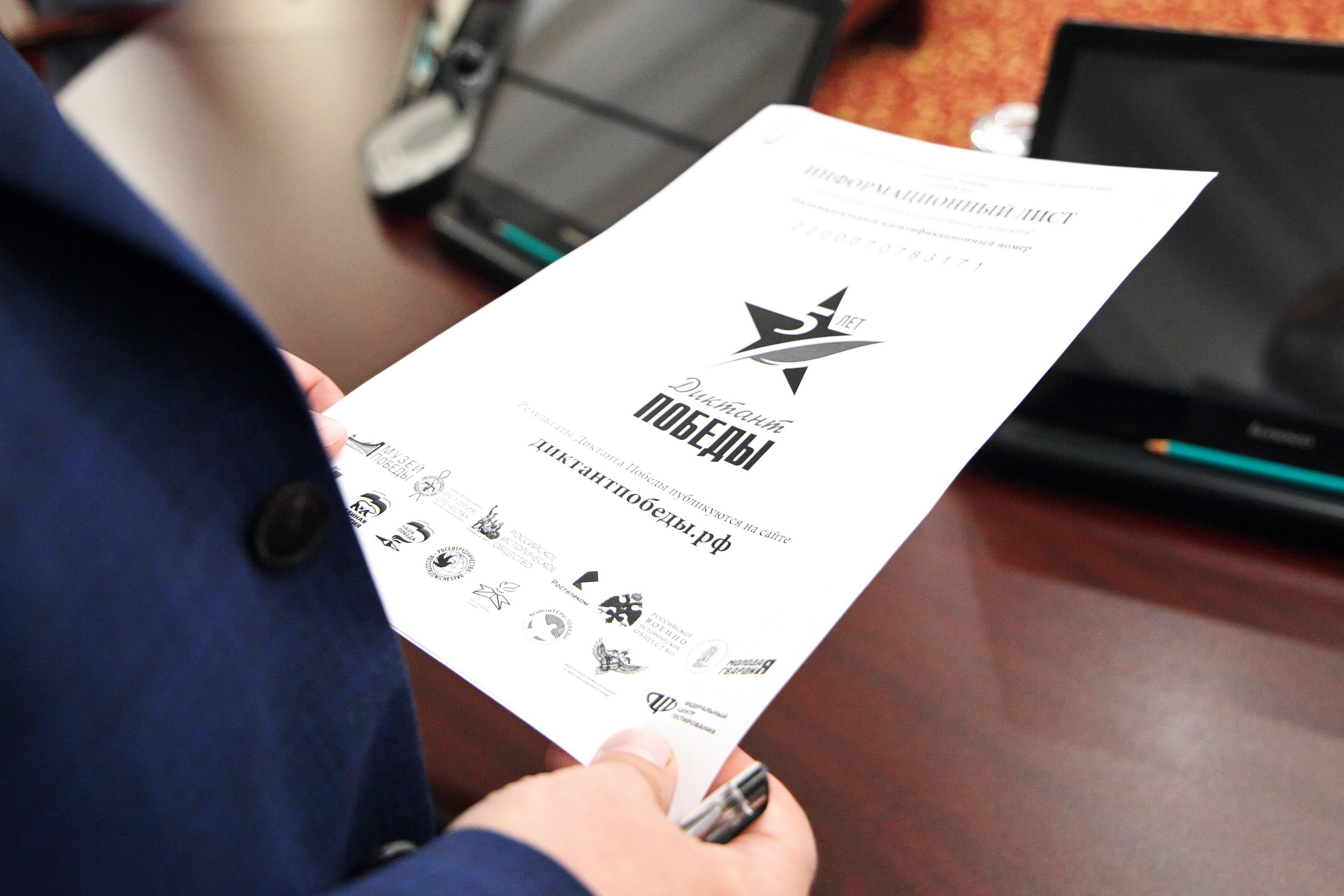 Старт просветительской акции дал председатель Российского исторического общества, директор СВР Сергей Нарышкин . «Диктант Победы» объединяет людей разного возраста, разных профессий, людей, для которых образ Великой Победы остается высоким нравственным ориентиром. Я уверен в том, что участие в этой историко-патриотической акции является достойным способом отдать дань памяти и уважения нашим отцам и дедам, победившим в жесткой борьбе с опасным врагом — с нацистской Германией. Рассчитываю, что «Диктант Победы» мотивирует всех его участников на дальнейшее изучение нашей богатой многовековой истории», — сказал он.