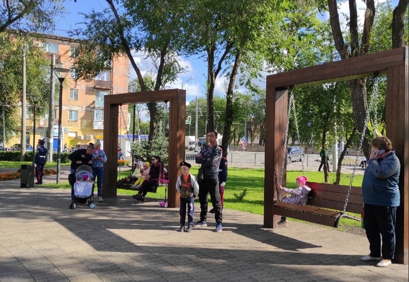 Кроме того, в сквере появились скамейки, расположенные вдоль окружности сквера, новые подвесные скамьи-качели, флагштоки. По периметру сквера установили ограждения, обустроили уличное освещение.
