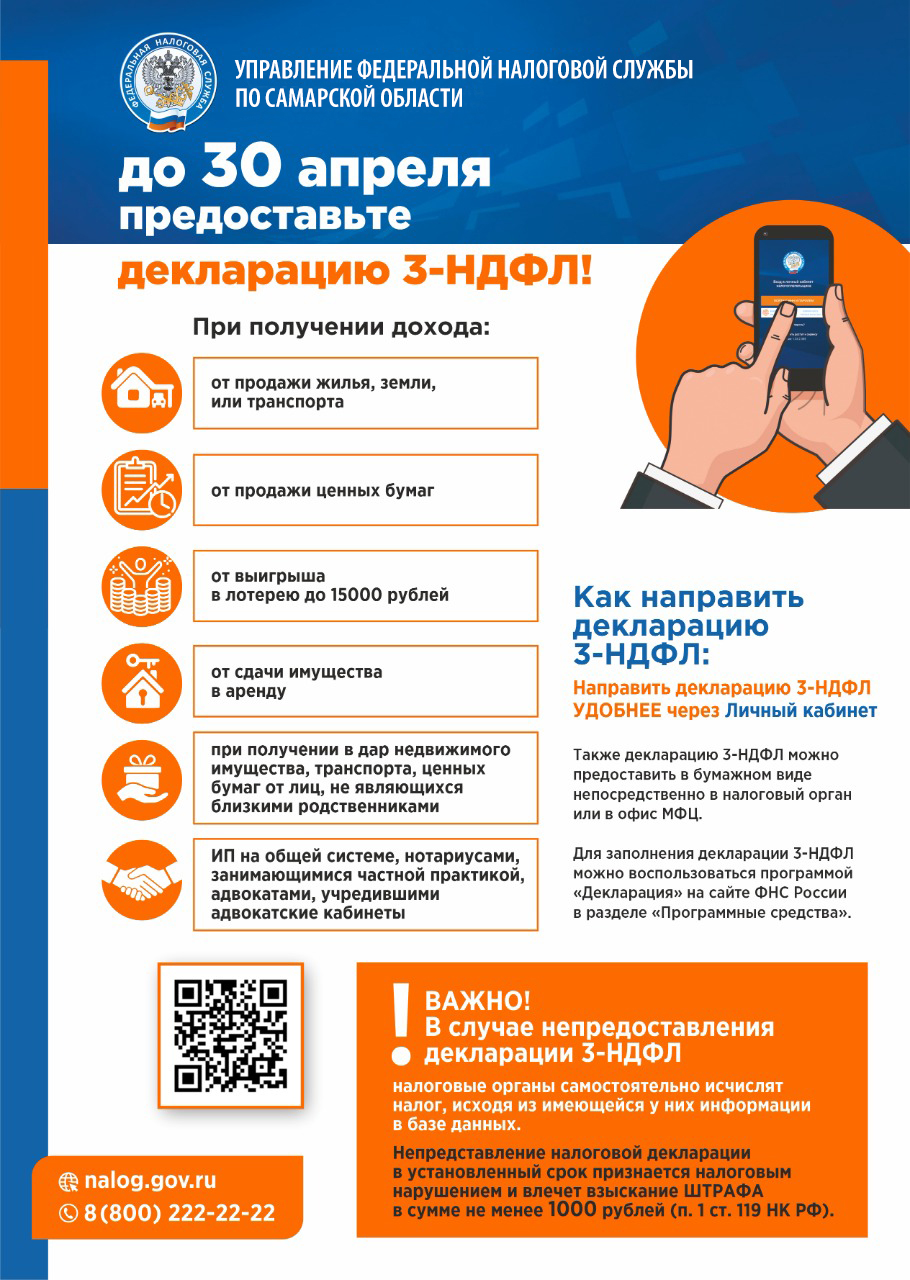 В Самарской области проходит ежегодная Декларационная кампания Пришло время отчитаться о полученных в 2023 году доходах – до 2 мая 2024 года жителям Самарской области предстоит подать декларацию 3-НДФЛ.