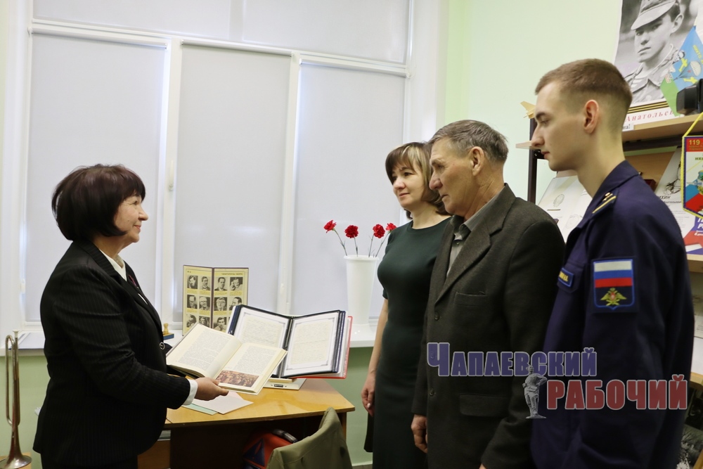 — Сегодня в вашей школе торжественное мероприятие, — обратилась к ребятам и учителям заместитель главы г. о. Чапаевск по социальным вопросам Екатерина Анисимова. — Для нашего города День героев Отечества — особенный праздник, уверена, вы хорошо знаете историю своей малой родины. В прошлом году в эту же пору мы с вами открыли бюст Сергея Хихина около центрального входа, теперь начинает работать зал боевой славы и музей. Память, которую вы здесь сохраните, будет передаваться из поколения в поколение.