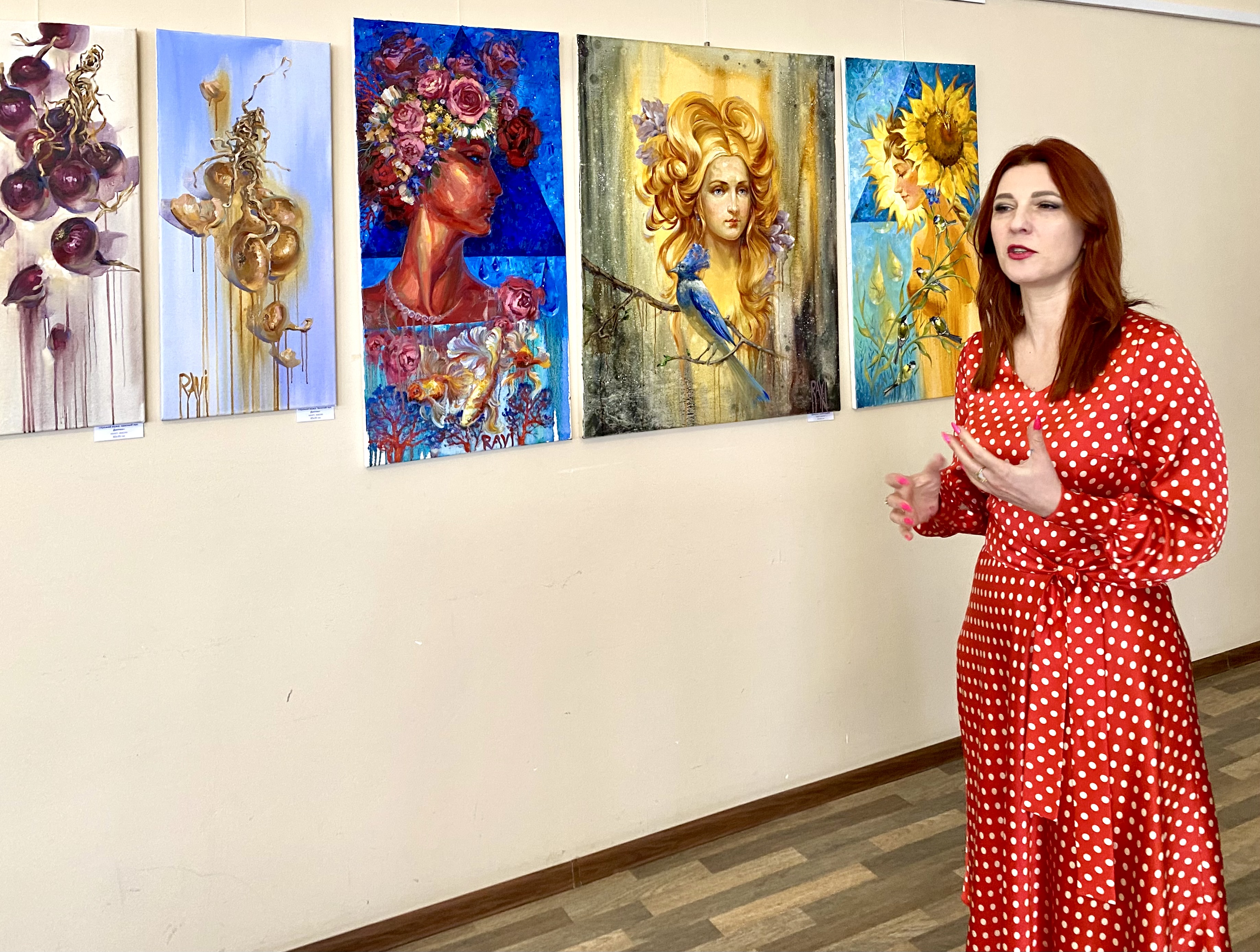 Входя в экспозиционные пространства библиотеки, на лицах участников вернисажа сразу появлялись улыбки – ведь на них пахнуло весной, радостью бытия, энергией жизни и солнца (Ravi с санскрита – солнце)! И приветствовала гостей выставки автор тоже с улыбкой, сама будто яркий цветок, привлекающий внимание всего окружающего мира. А еще на зрителей пахнуло масляными красками. Наталья тут же объясняла:
