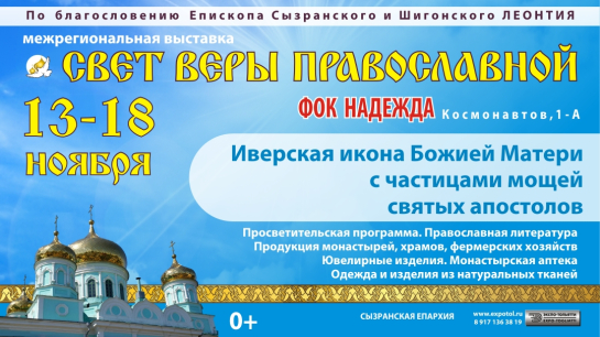 С 13 по 18 ноября для жителей и гостей Сызрани будет работать православная выставка «Свет веры православной». Она расположится в ФОКе «Надежда» на проспекте Космонавтов, 1А.