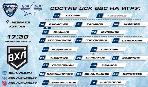Стал известен состав ЦСК ВВС на сегодняшнюю игру с ХК «Зауралье» (Курган).