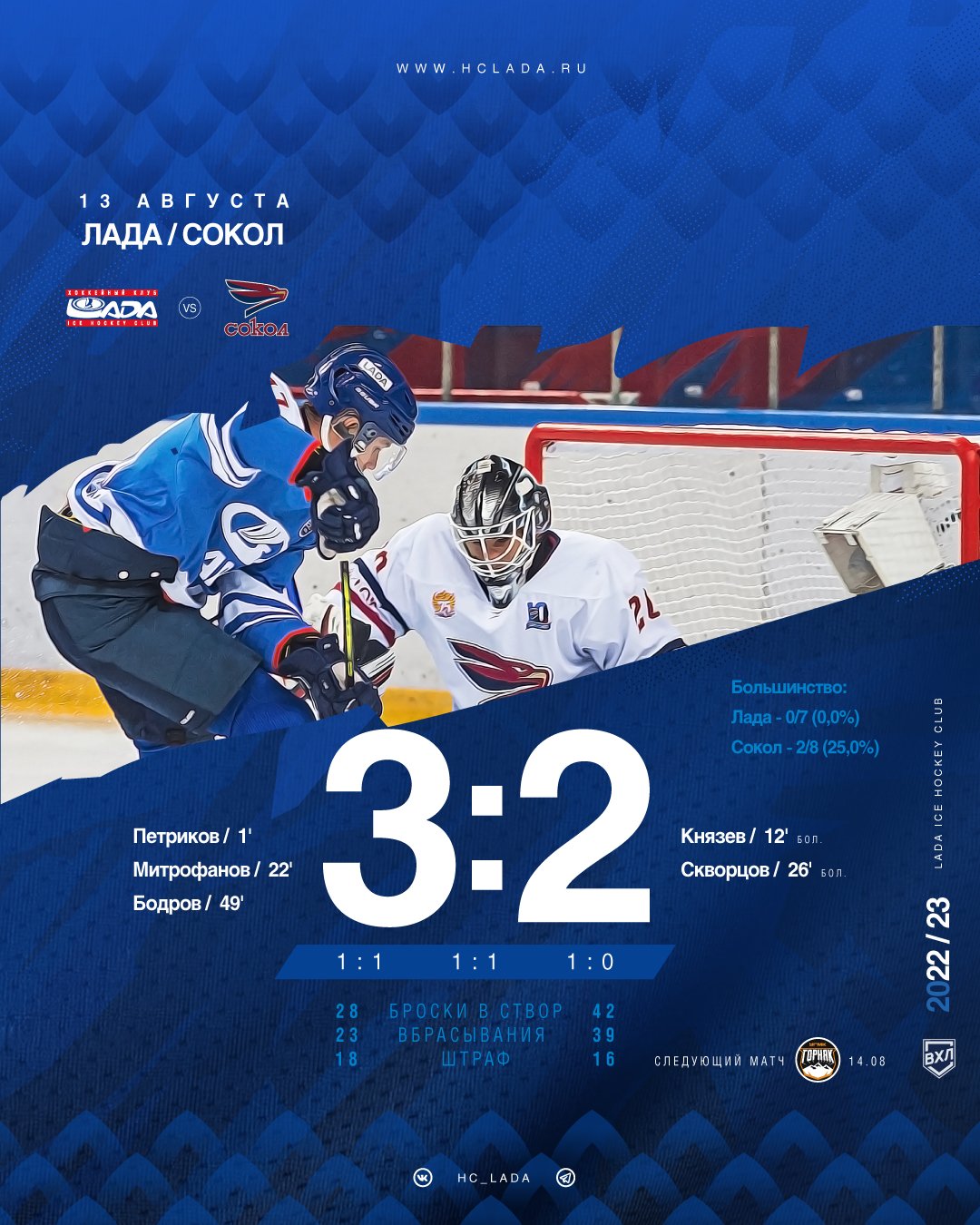 13 августа. «Лада» - «Сокол» (Красноярск) – 3:2 (1:1, 1:1, 1:0)