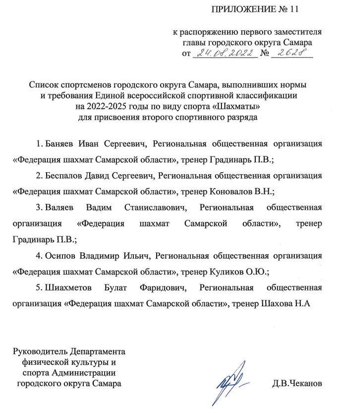 Распоряжение о присвоении спортивных разрядов спортсменам г.о. Самара.