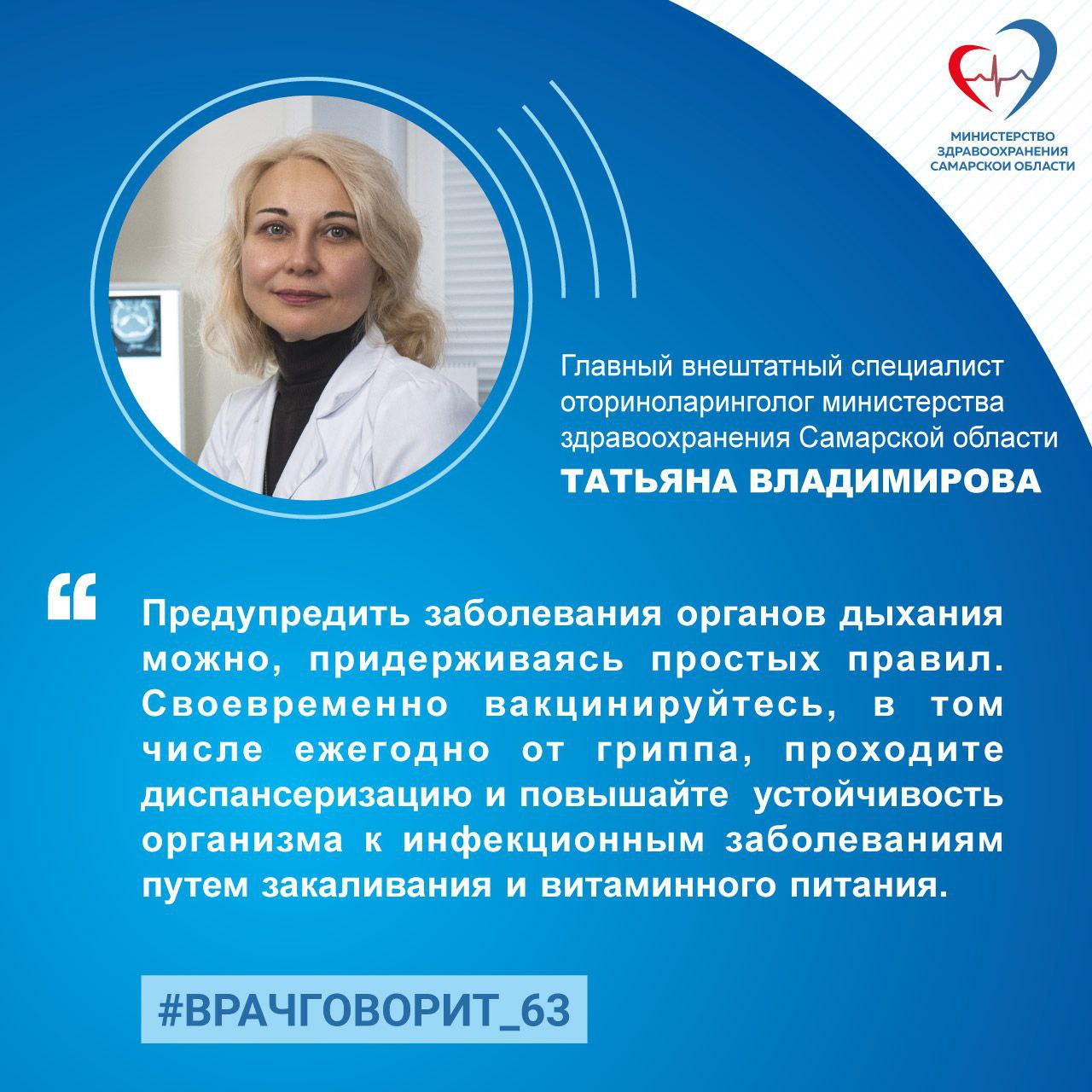 Главный внештатный специалист оториноларинголог министерства здравоохранения Самарской области, заведующий кафедрой и клиникой оториноларингологии имени академика И.Б.Солдатова СамГМУ, врач-оториноларинголог Татьяна Владимирова: