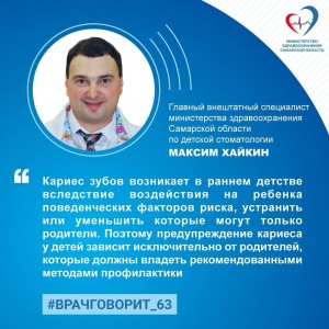 «В Самарской области в 1986 году была разработана и внедрена первая в России комплексная программа профилактики стоматологических заболеваний. В 2000 году проведена коррекция программы с учетом достигнутого уровня стоматологического здоровья детей и поведенческих факторов риска. За время внедрения программы интенсивность кариеса временных зубов снизилась на 29%, постоянных зубов у детей школьного возраста — на 46 %. Кариес зубов возникает в раннем детстве вследствие воздействия на ребенка поведенческих факторов риска, устранить или уменьшить которые могут только родители. Поэтому предупреждение кариеса у детей зависит исключительно от родителей, которые должны владеть рекомендованными методами профилактики», — рассказал главный врач Самарской городской клинической стоматологической поликлиники №1 Максим Хайкин.