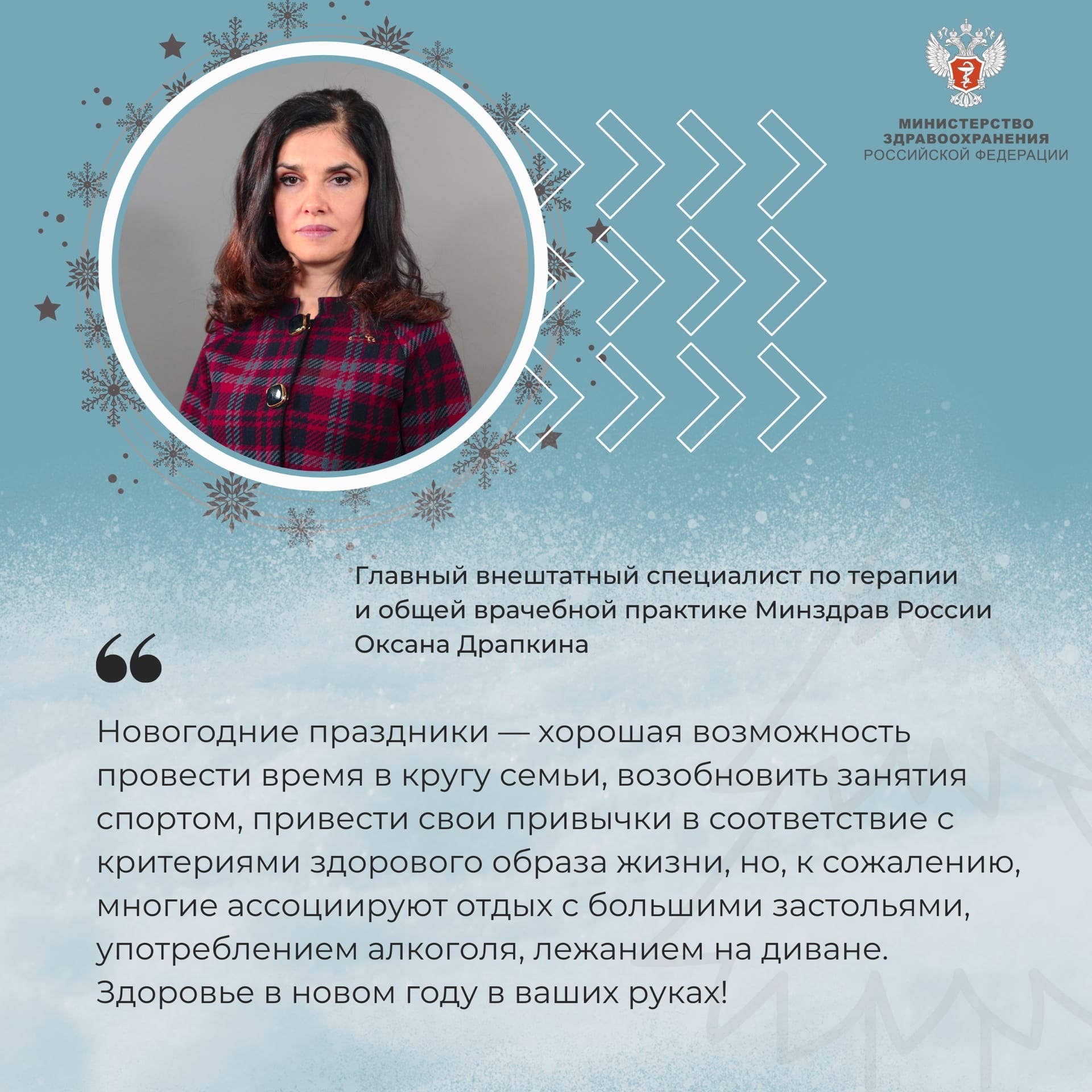 Главный внештатный специалист по терапии и общей врачебной практике Минздрав России Оксана Драпкина о том, как провести новогодние праздники и сохранить здоровье