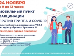 24 ноября с 9 до 12 часов в Тольятти будет работать мобильный пункт вакцинации против гриппа и COVID-19 в ТОС-9 по адресу: бульвар Туполева, 11.