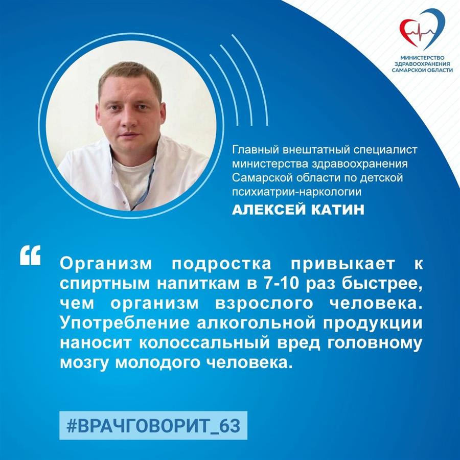 Главный внештатный специалист министерства здравоохранения Самарской области по детской психиатрии-наркологии, заведующий амбулаторно-подростковым отделением Самарского областного клинического наркологического диспансера, врач-психиатр-нарколог, к. м. н. Алексей Катин рассказал об опасности алкоголя для молодых людей.