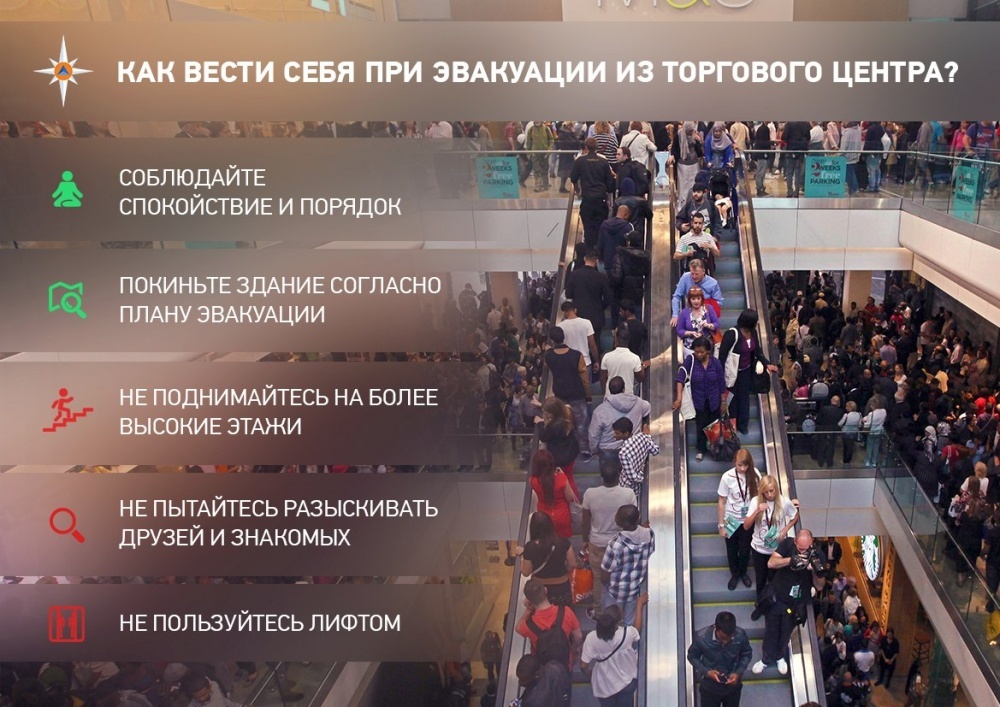 Приходя в торговый центр, нужно обязательно ознакомиться с планами эвакуации – они должны быть на самых видных местах;
