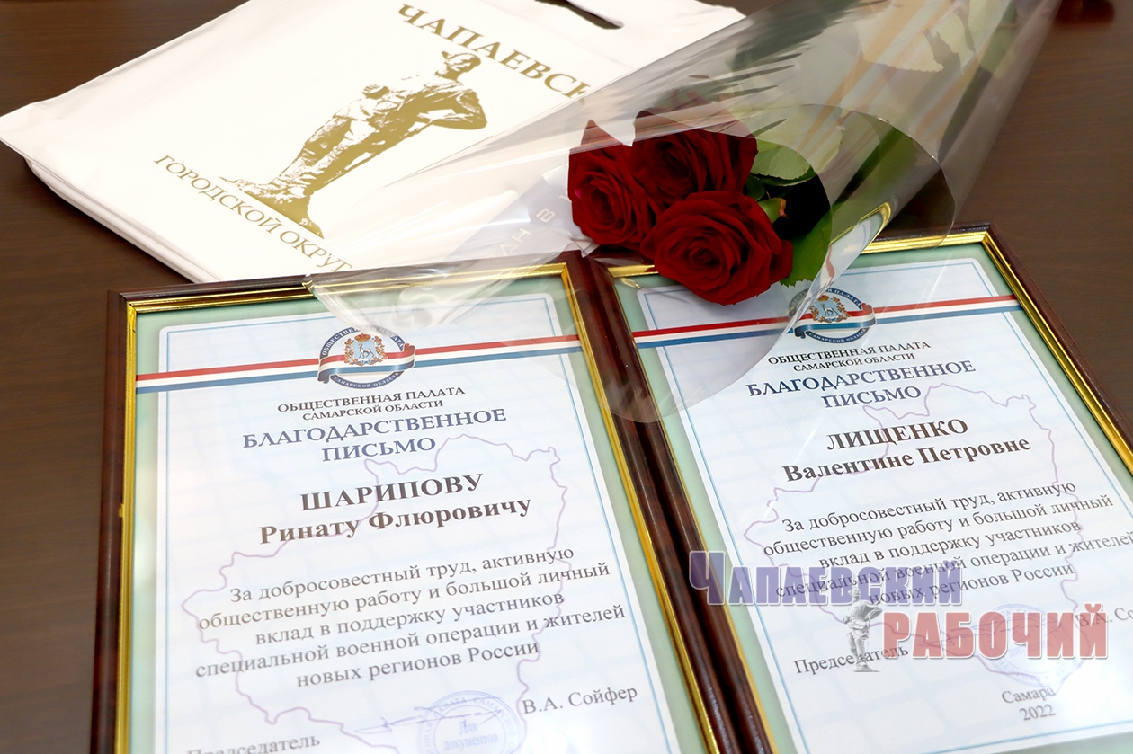 Вчера в администрацию города пригласили лидеров общественного движения «Мы вместе» Рината Шарипова и Валентину Лищенко. Волонтерский труд этих людей отмечен благодарственными письмами общественной палаты Самарской области. Награды вручил глава г. о. Чапаевск Александр Кузнецов.
