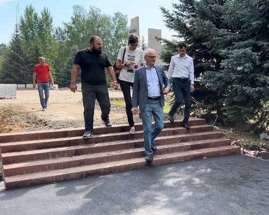 Также в Парке Победы продолжается асфальтирование пешеходных аллей, ведется укладка брусчастки. Работы идут в том темпе, на который и рассчитывали, поэтому благоустройство должно завершиться своевременно, к 1 сентября.
