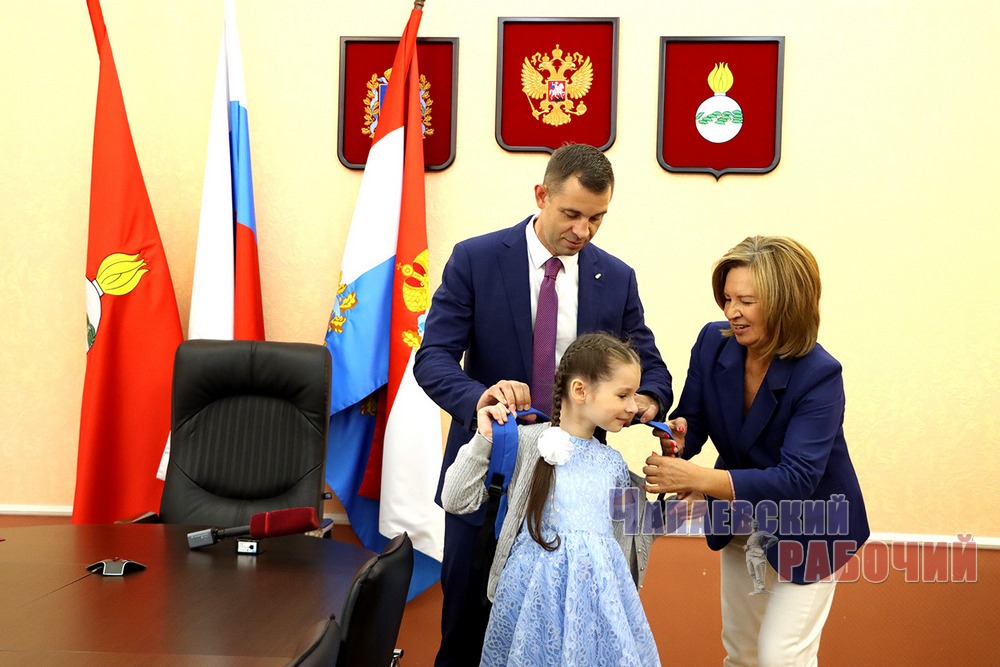 В понедельник в администрации городского округа Чапаевск будущих школьников не только поздравили с наступающим Днем знаний. Девять ребят стали обладателями новеньких ранцев и нужных в учебе канцтоваров: тетрадей, ручек и карандашей, ластиков и точилок, а также бумаги и картона для поделок, досок для лепки, альбомов для рисования… В общем, целый набор для развития талантов.