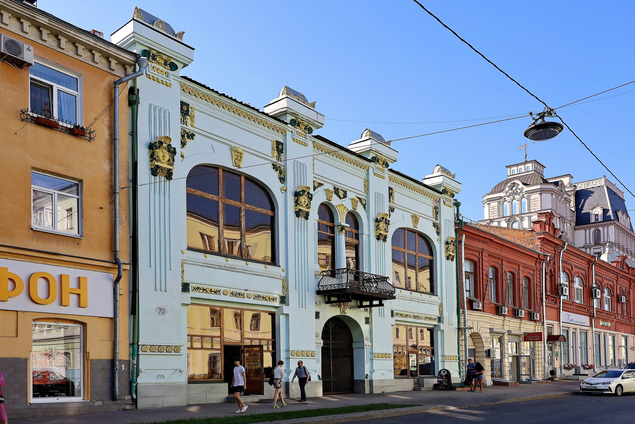 Торговый дом ПермяковойИменно под таким названием это здание — под номером 70 — вошло в историю. Видно, что купчиха Александра Пермякова не пожалела средств на отделку фасада. Здесь и изысканные орнаменты в стиле модерн, и кованое ограждение балкона, и лепные женские маски. До революции на стене можно было увидеть и фамилию владелицы, написанную большими буквами.