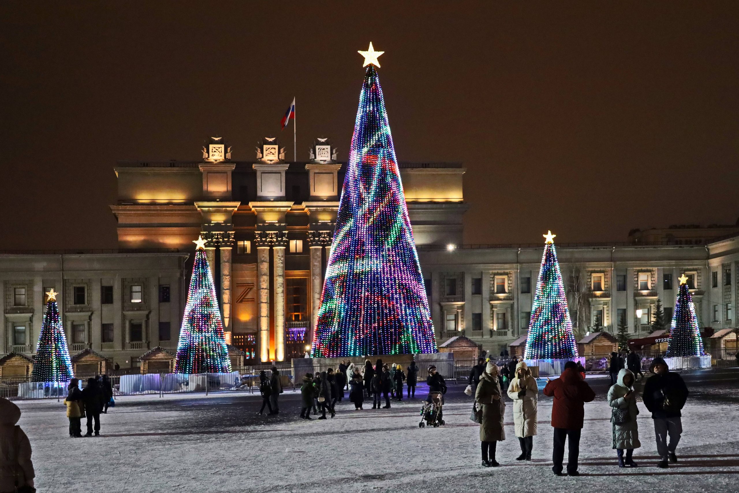 Центром притяжения на каникулах стала площадь Куйбышева. На ней традиционно расположились елки, интерактивные экраны, на которых транслировались поздравления, светящиеся украшения, а также ледяные фигуры северного оленя и Снежной королевы.