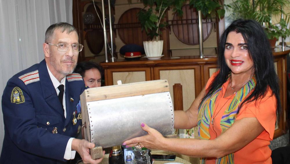 Наталия Викторовна, являясь руководителем Русского культурно-просветительского центра «Наследие» г. о. Чапаевск вручила Юрию Васильевичу экспонат для казачьего подворья — ручную маслобойку, переданную ей жителями села Марьевка. Центр «Наследие» бережно относится к таким раритетам, так как они позволяют познакомиться современной молодежи с историей нашего края и страны, с ценностями населяющих Россию народов. В ближайшее время планируется передать еще два чугунка для русской печи, керосиновые лампы, старинный медный таз, прялки и другое. Заместитель председателя Совета Ассамблеи народов Самарской области Роман Товченко сказал, что всем этим вещам найдется достойное место.
