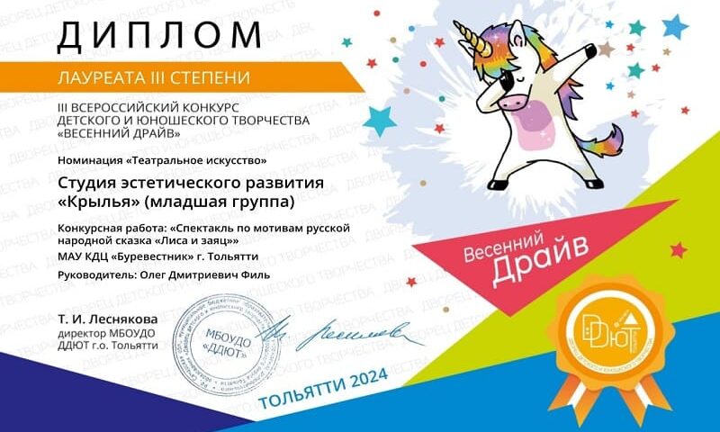 Спектакль по пьесе Ольги Зверлиной «Маленькие комедии на школьной перемене» (цикл из четырёх минипьес), старшей группы (10-14 лет), Студии эстетического развития «Крылья» МАУ КДЦ «Буревестник» г.о. Тольятти – стал дипломантом 3 степени.