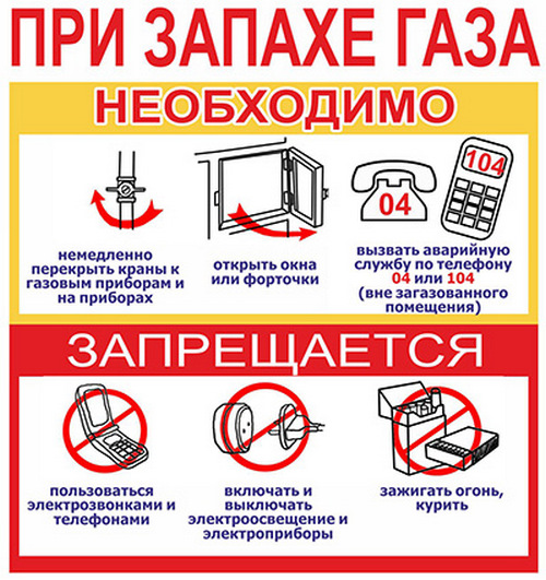 - при появлении в помещении квартиры запаха газа немедленно прекратить пользование газовыми приборами, перекрыть краны к приборам и на приборах, открыть окна или форточки для проветривания помещения, вызвать аварийную газовую службу по телефону 04 (вне загазованного помещения)! Не зажигать огонь, не курить, не включать и не выключать электроосвещение и электроприборы, не пользоваться электрозвонком.