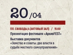 20 апреля в 15.00 ч. в актовом зале администрации (пл. Свободы, 4) фестиваль откроется выставкой документов «Земство и советы: две власти в судьбе местного самоуправления» из фондов МКУ «Тольяттинский архив».