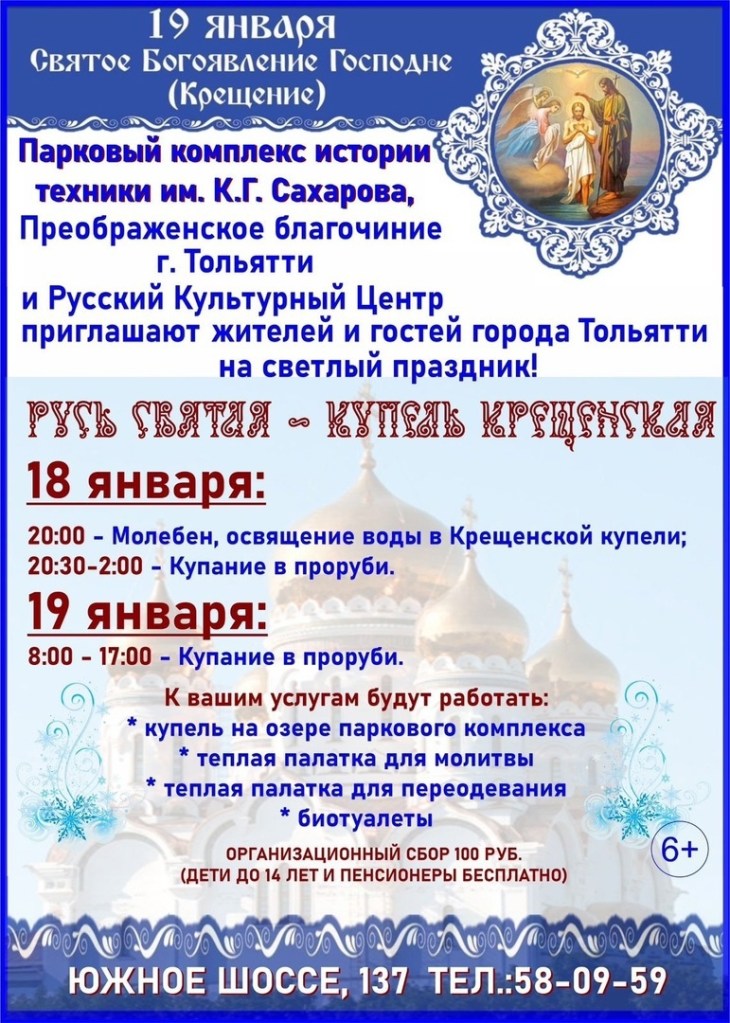 В преддверии светлого праздника Крещения Господня, который отмечается 19 января, в Тольятти Парковый комплекс истории техники имени К.Г. Сахарова совместно с Преображенским благочинием и Русским Культурным Центром проводит мероприятие, включающее молебен с освящением воды и купание в проруби. Желающие смогут принять участие в Крещенских купаниях на центральной площадке. Такое мероприятие проводится на этом месте уже в 9-й раз. Об этом сообщили в администрации Тольятти.